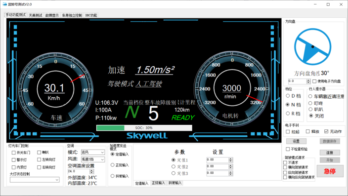 1.蓝鲸号测试系统采用C#编写,可实现手动功能测试、天美测试、故障显示和车身独立控制。