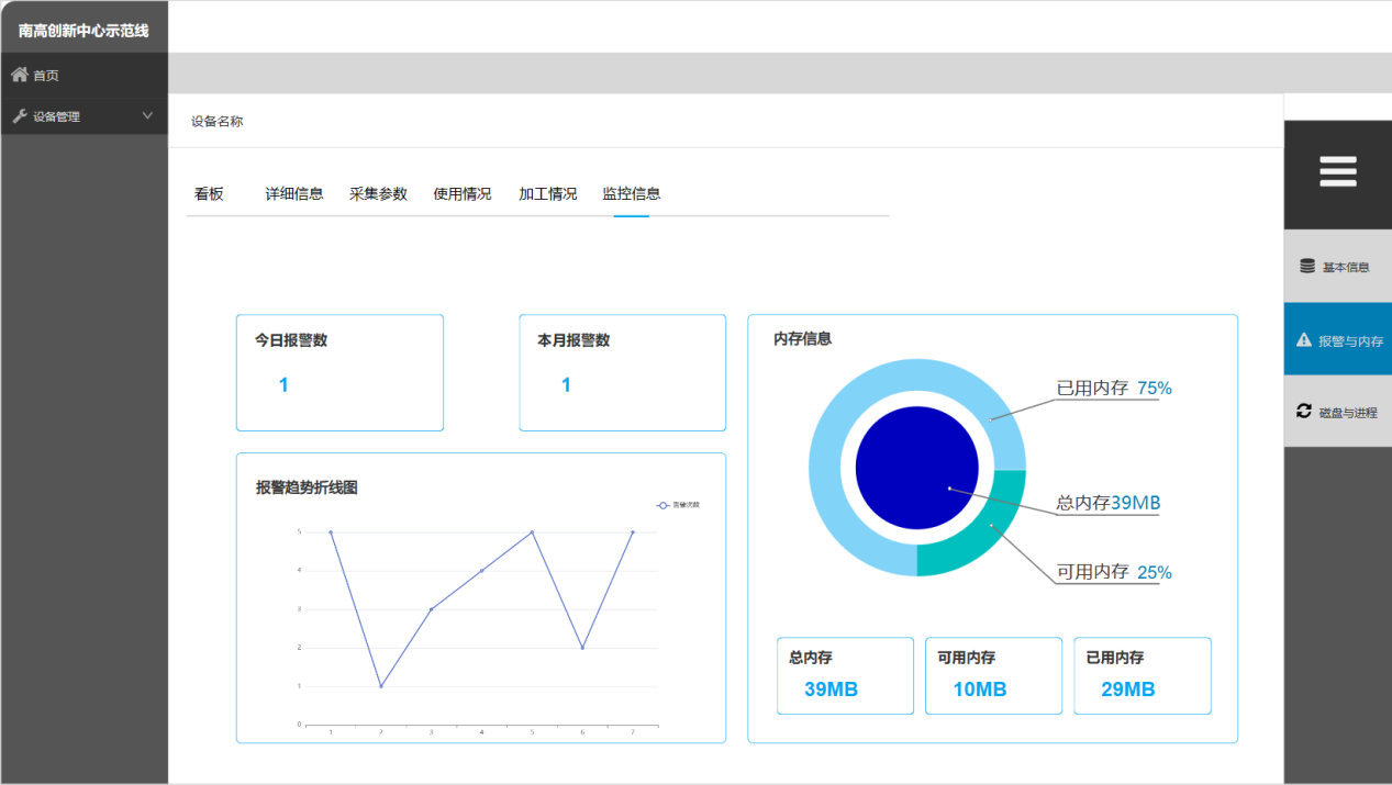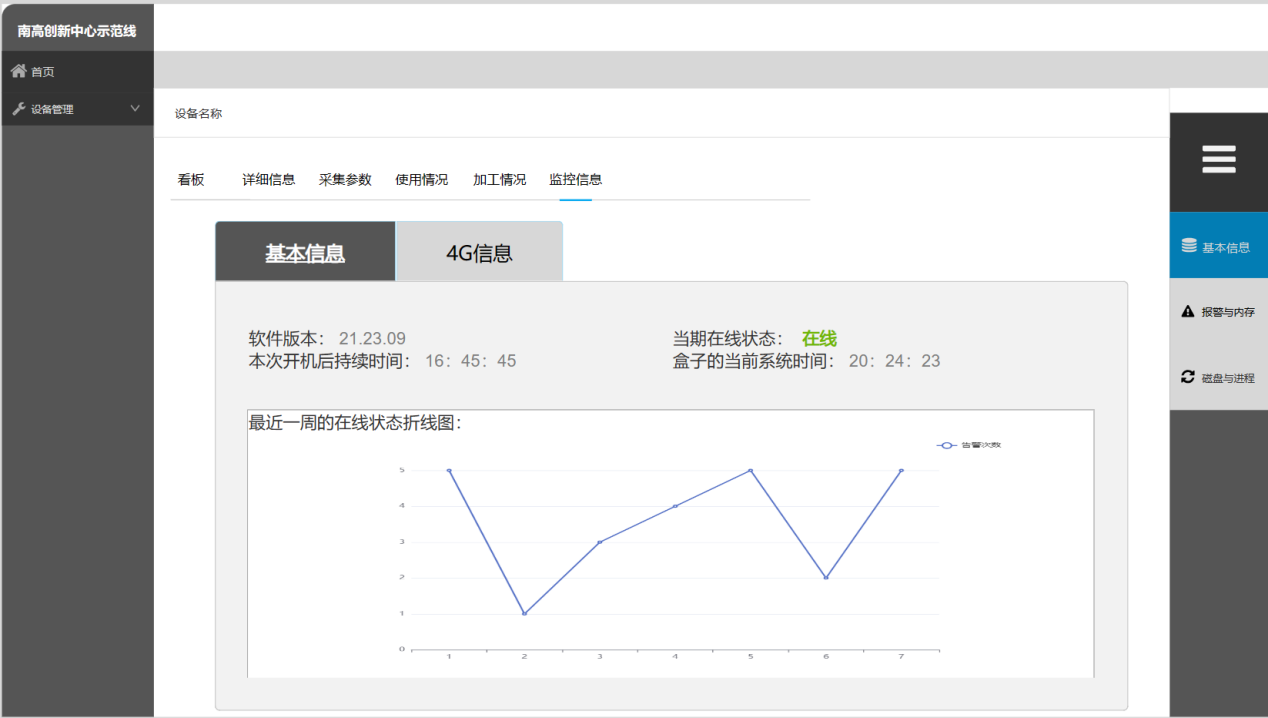 3.基于设计需求进行页面设计。页面首先隶属于设备管理页面,其次属于监控信息栏内容,选择监控信息按钮即可打开相关内容。信息内容分为四个部分,基本信息栏:软件版本、本次开机后持续时间、当期在线状态、最近⼀周的在线状态折线图、盒⼦的当前系统时间;4G信息:4G基本信息、4G当前信号强度、4G信道错误率、当前4G流量发送流量和接收流量,单位KB(点击可以显示历史发送和接收流量,按天折线图)、最近⼀月的按天统计数据流量折线图;报警信息:今日报警数、本月报警数、报警趋势折线图,最近⼀周按天统计;操作系统信息: