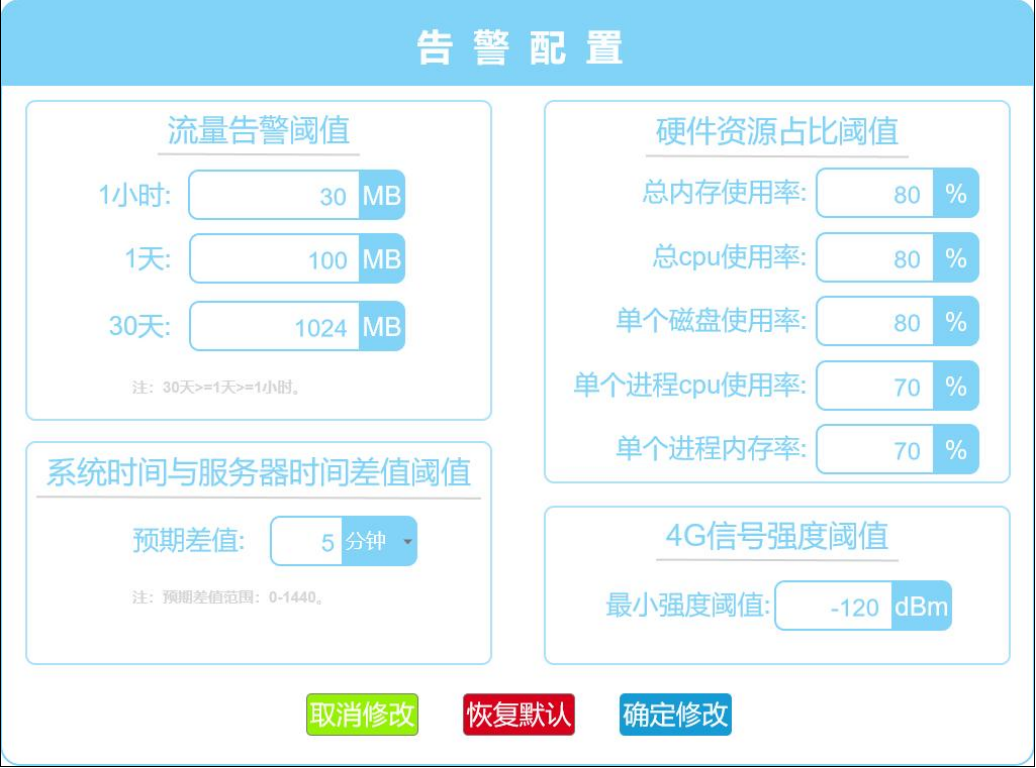 2.基于设计需求来对配置页进行页面设计,首先将页面分为四块,分别用于“流量告警阈值”、“4G 信号强度告警阈值”、“硬件资源占比告警阈值”和“系统时间与服务器时间差值告警阈值”的配置,同时增加“取消修改”、“恢复默认”、“确定修改”三个按钮,分别用于“取消本次配置修改,配置内容恢复为上一次修改内容,同时返回装备一览页面-修改前”、“将告警配置内容恢复到初始状态配置内容”、“确定本次配置修改,配置内容更新为当前修改版本,同时返回装备一览页面-修改后”。